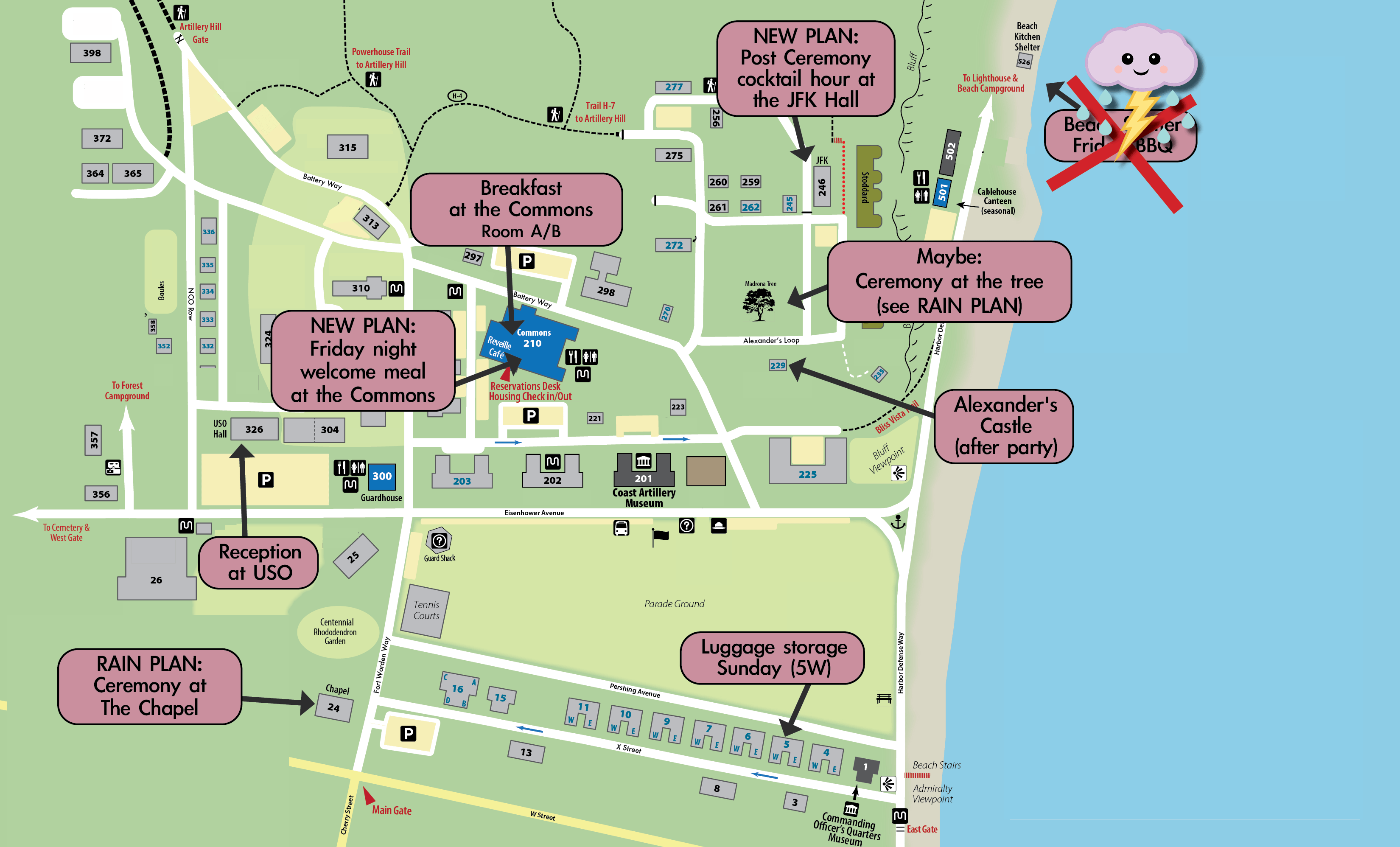 Due to weather, we’ll be eating dinner Friday night in the Commons, room A/B. The Commons is at the center of the Fort Worden campus, the same place as reception. There is parking, but it’s also a pretty quick walk for on site housing.